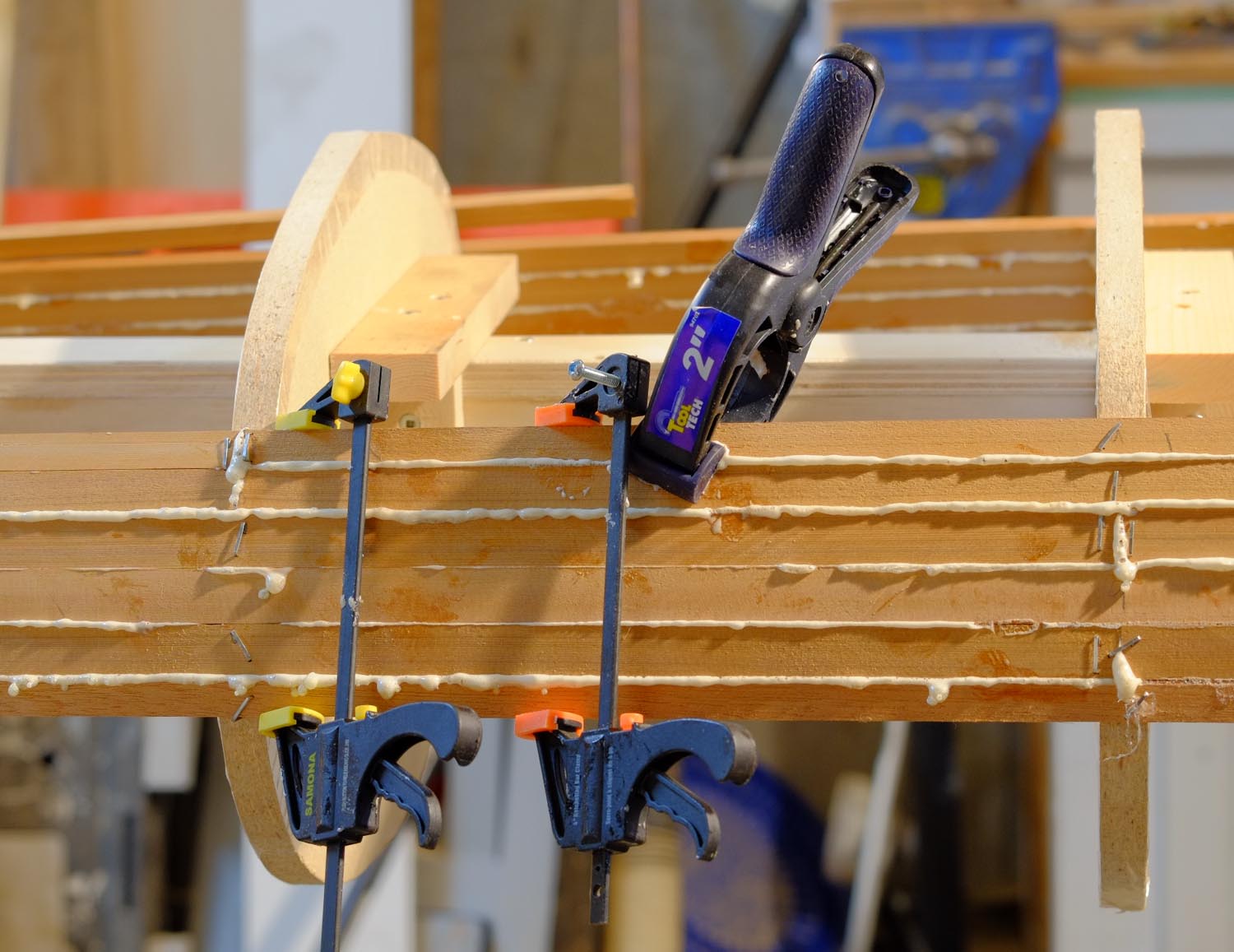 Staples would secure most strips but I needed clamps at the bow and stern too. I used a maple keel and mahogany sheer strip – great for bracing clamps as red cedar is just too soft for repeated clamping.