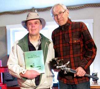 The Maritime Centre's outboard motor expert Tony Owen (right) with "Classic British Seagull" author Don Meyer (left) at the Maritime Centre last week.